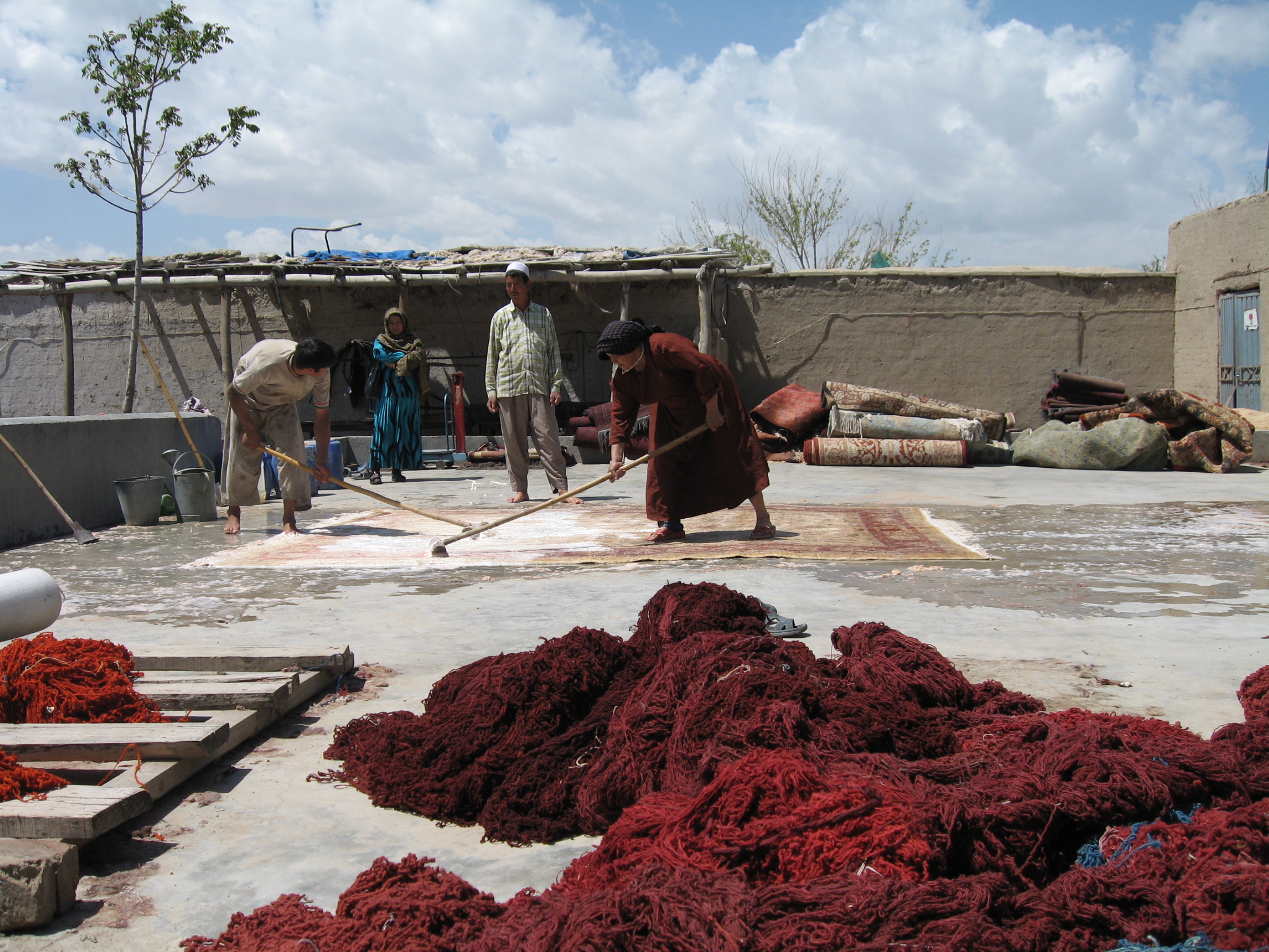 Freshly dyed wool drying in the sum while a carpet is being washed and prepared for market in the background.