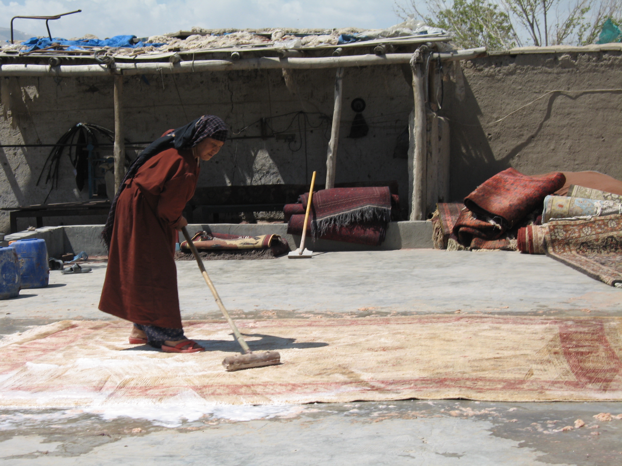 The washing process. Preparing a carpet for the marketplace.