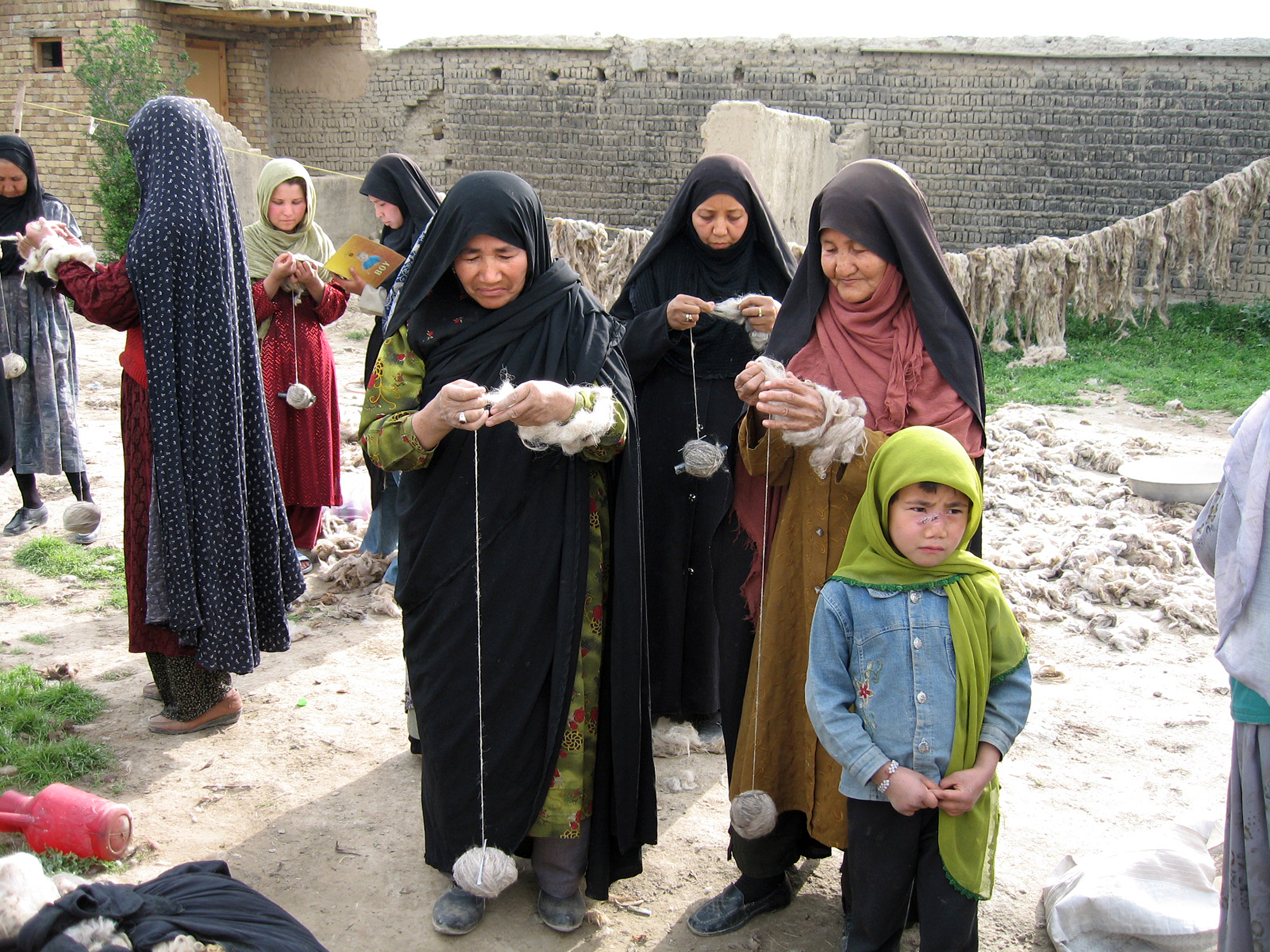 Afghan women spinning wool into thread so it can be woven to make a carpet.