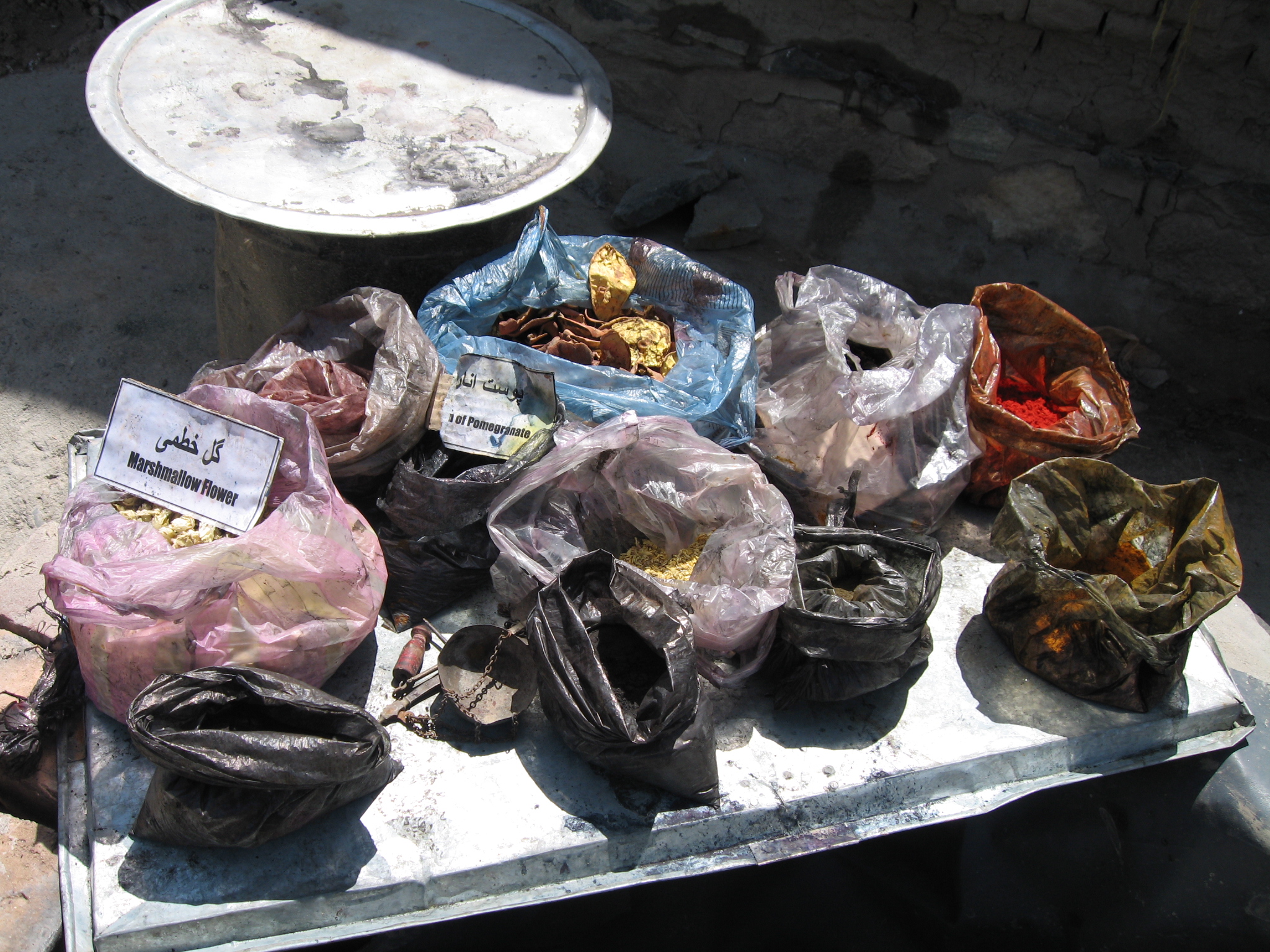 Close up of sources of vegetal colors derived from plant flowers, stems, buds and also fruits and fruit rinds.