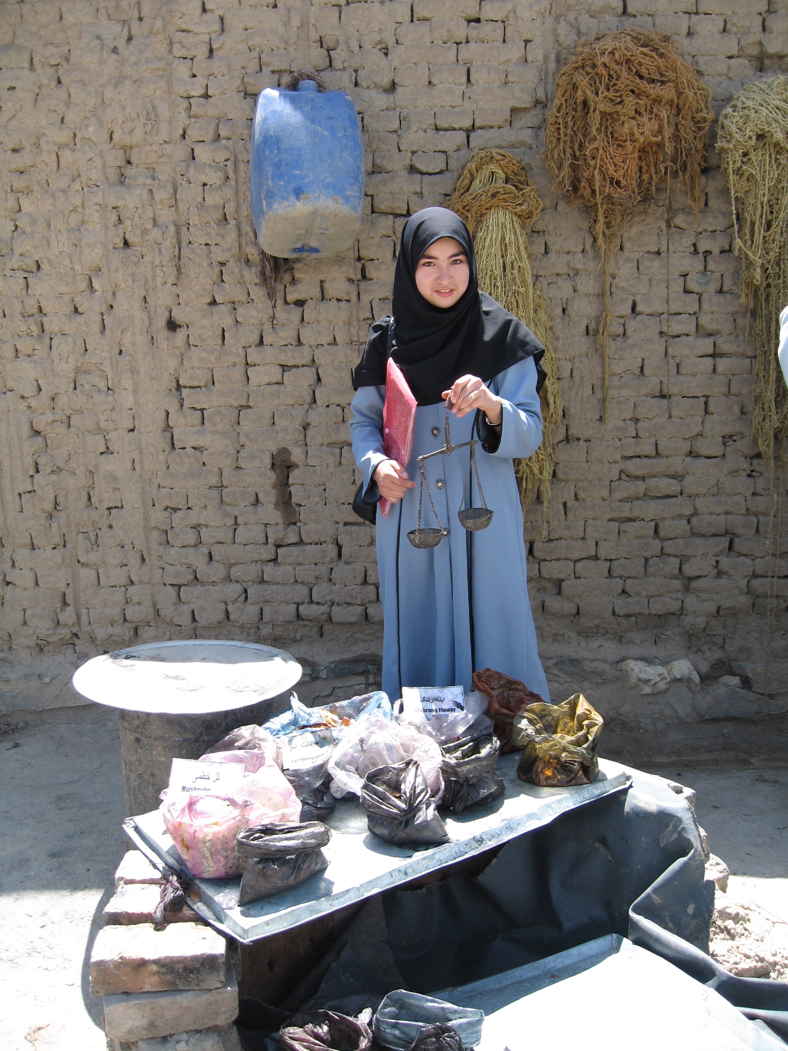 Afghan woman, holding a balance scale, demonstrates how to measure vegetal dyes for the dyeing pot.