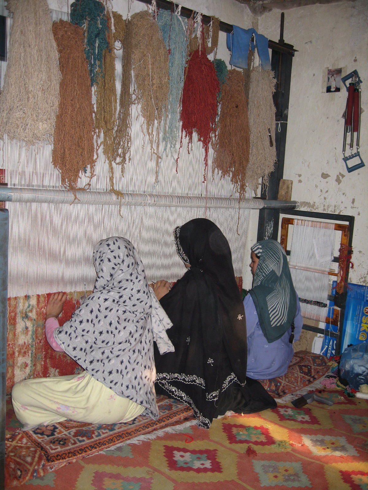 Afghan women, working as a team, weaving a carpet on a vertical loom in a studio in Kabul.