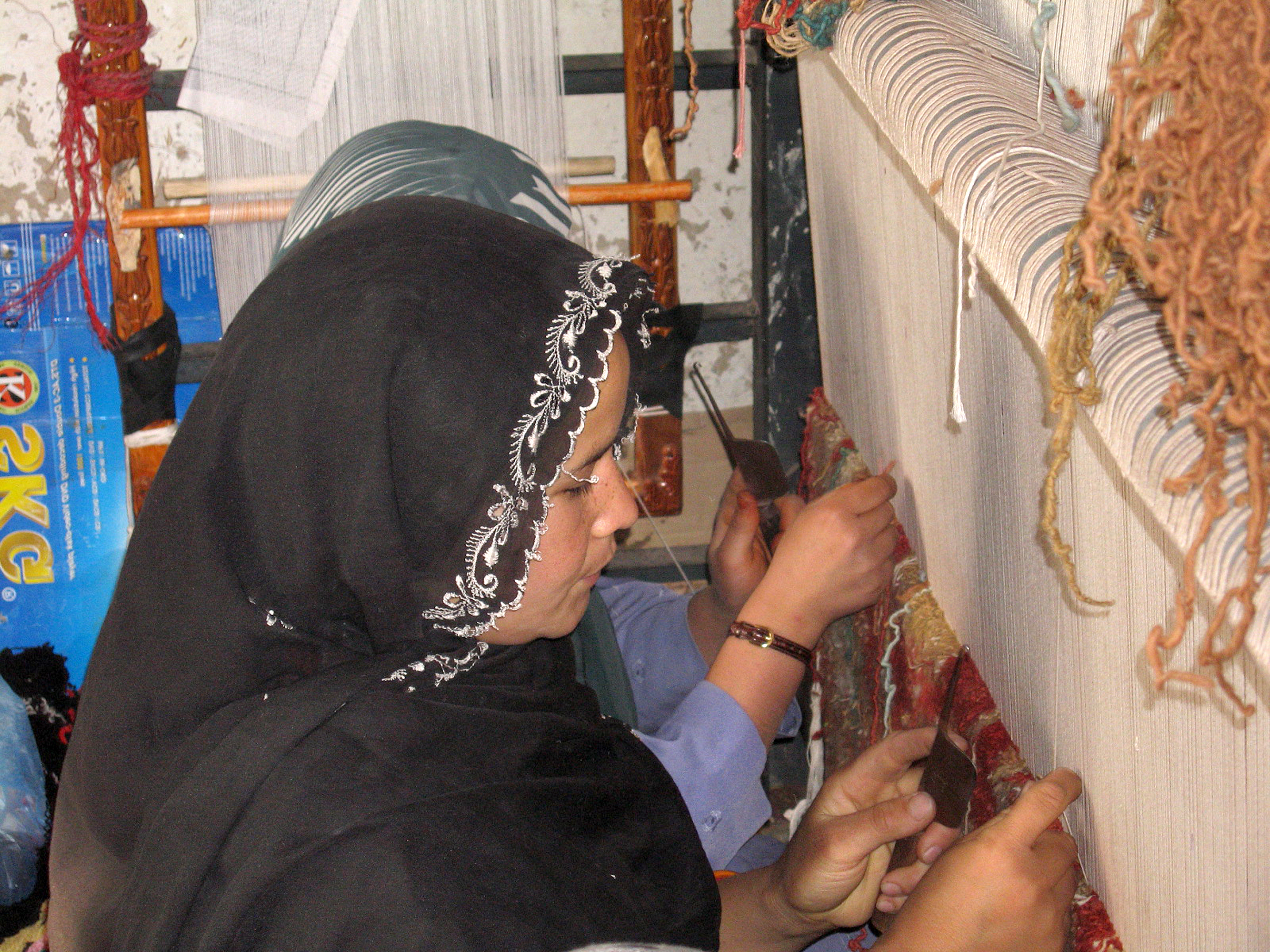 Afghan women, working as a team, weaving a carpet on a vertical loom in a studio in Kabul.